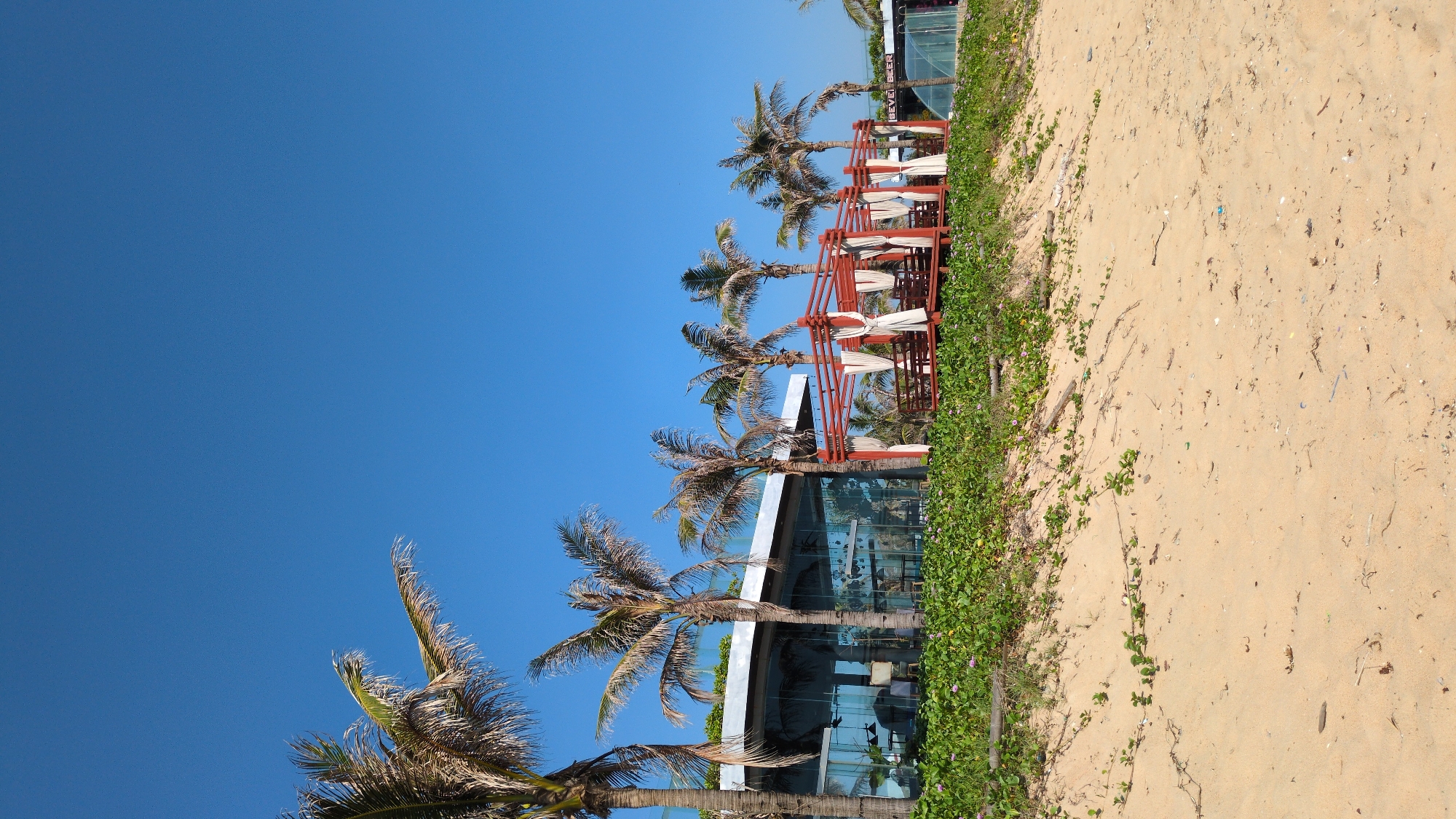 The image depicts a beach scene in Unknown, Vietnam. The sky is clear blue. Along the beach edge, there are several palm trees, some near a modern glass-walled building with visible interior furnishings. Red metal structures with white fabric canopies are positioned near the building. The beach itself consists of light tan sand with scattered debris. Green vegetation grows along the boundary between the building and the sand.