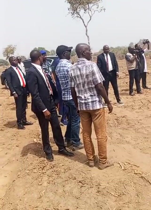 A group of men are standing in a field of dry, reddish-brown dirt and sparse vegetation, under a hazy sky. Most of the men are wearing suits, some with ties, while others are dressed in casual attire such as a plaid shirt and jeans. A man at the rear of the group is holding a camera, and what appears to be a police officer in uniform is standing off to the side. The men are looking in various directions, seemingly engaged in conversation or observation. A vehicle is parked on the edge of the field. A lone, leafless tree stands in the background.