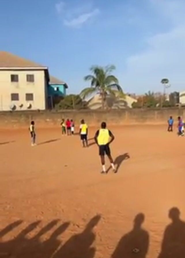 group of people standing and walking on a dirt field on a sunny day. Most of the people are wearing either yellow vests or blue shirts. There are a few people wearing red. Some of the people appear to be talking to each other, although the audio is not clear enough to discern what they are saying. The field is surrounded by a wall. Behind the wall, there are buildings and trees.
