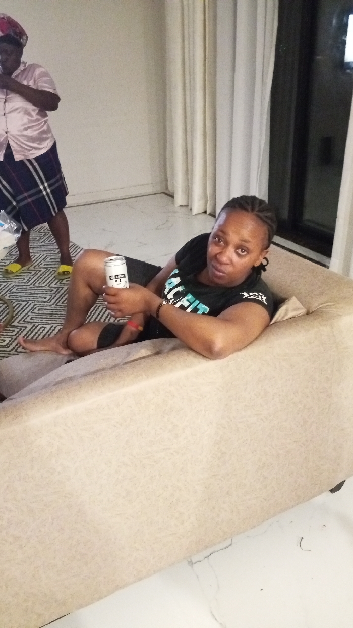 A woman reclines on a light brown couch, holding a can of Smirnoff Ice. She wears a black t-shirt and black shorts. Her hair is braided. In the background, another woman stands on a geometric patterned rug, wearing a pink button-down shirt, a blue plaid skirt, and yellow slippers. White curtains hang nearby, and a window or doorway is to the right of the curtains. The floor is white marble.