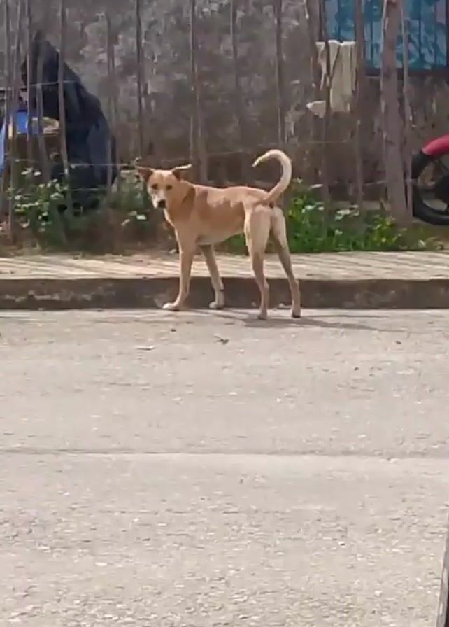 A brown stray dog stands in the middle of a grey road, near a curb and a chainlink fence with vegetation growing behind it. The dog is thin, with perked ears and a curled tail. The camera follows the dog as it turns to look at the viewer. A finger comes into frame and points at the dog. Then, the camera focuses on the dog, which is now walking forward towards the viewer. There is a figure sitting on a chair beneath a dark tarp or blanket, behind the fence. A motorcycle is also parked nearby.
