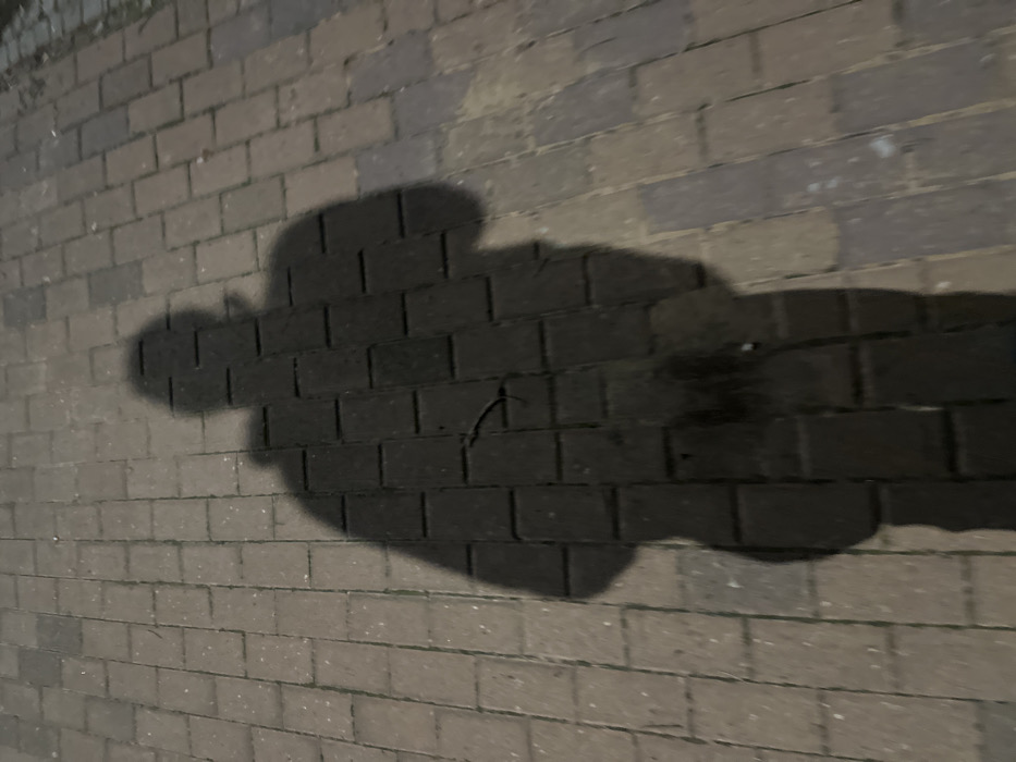 A shadow falls across a brick sidewalk