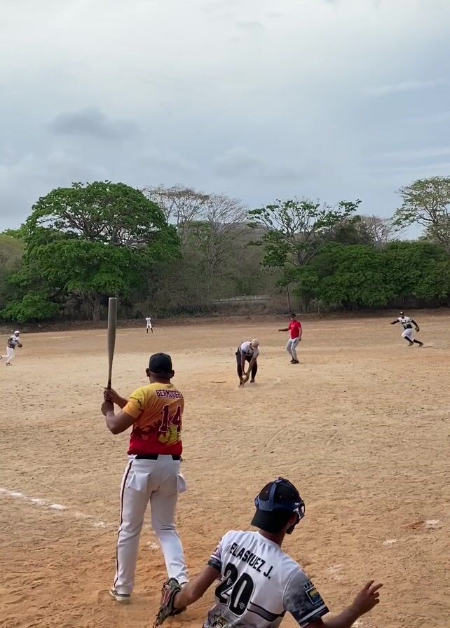 The video depicts a baseball game in progress. The batter, wearing a red and yellow jersey with the number 14 and the name "BERMUDEZ E" on the back, has just swung at the ball. A catcher in a white and blue uniform with the number 20 and the name "VELASQUEZ J" is crouched behind him, watching the play. The pitcher, wearing a black and white uniform, stands on the mound. Multiple other players are on the field, some running and some standing in position. The field is a dirt surface with a clearly marked white foul line. Trees surround the perimeter of the field. The sky is overcast with a cloudy, gray sky.