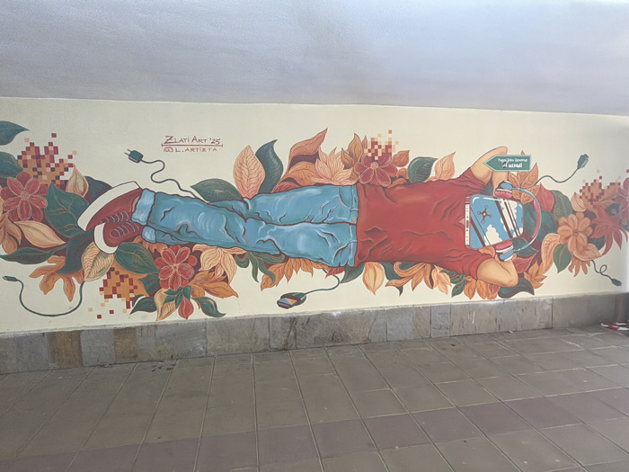 The image captures a vibrant mural located in the pedestrian underpass at Sofia University "St