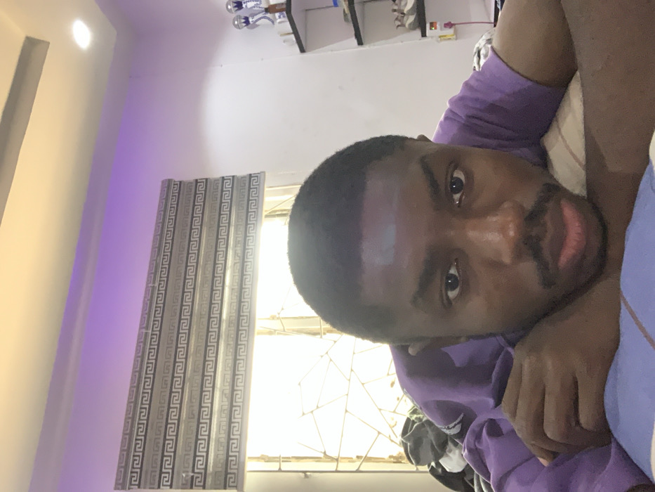 - "A Black male subject with short dark hair, a mustache, and a thin beard is depicted lying prone on striped bedding (blue/purple and beige), gazing directly at the viewer" by FM-VmBw42, licensed under CC BY 4.0