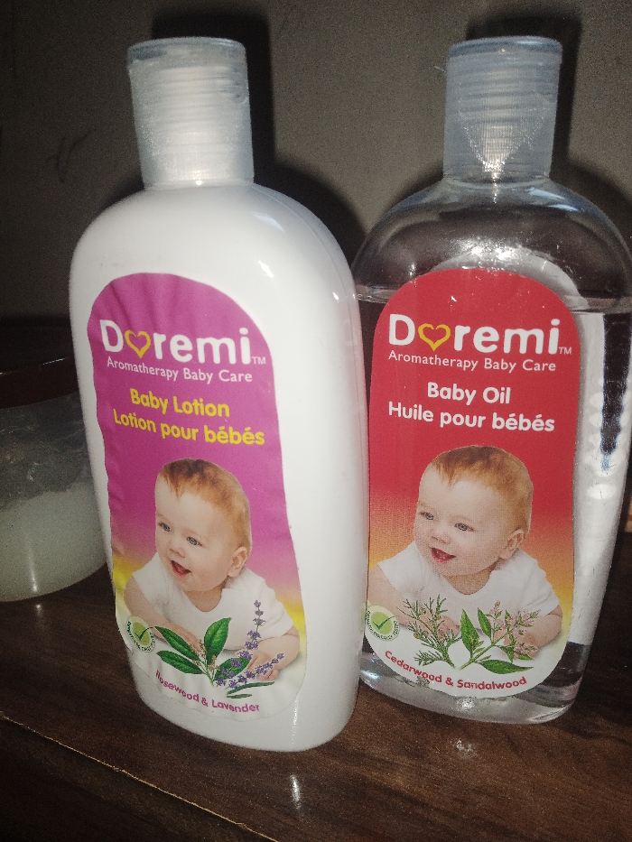 Two bottles of "Doremi Aromatherapy Baby Care" products are positioned on a dark, reflective wooden surface against a dark, undifferentiated background