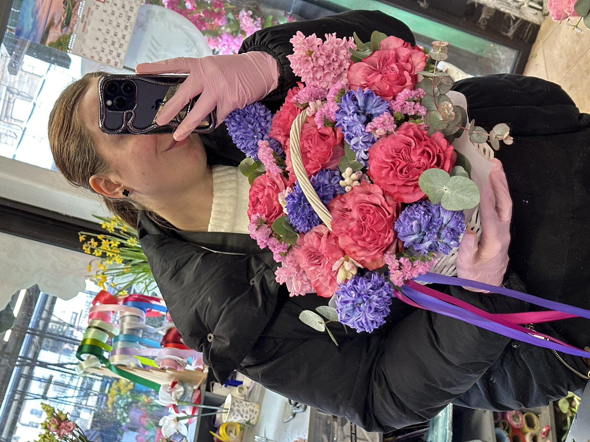 A person in Liepaja, Latvia holds a flower bouquet in a white wicker basket. The bouquet contains pink roses, purple hyacinths, and pink statice. The bouquet has two ribbons tied to it, one fuchsia and one purple. The person is wearing pink gloves and a black puffy jacket over a white top. They are holding an iPhone in their left hand, obscuring most of their face. The reflection in the background shows a window with colorful ribbons and other floral arrangements, along with part of a calendar.