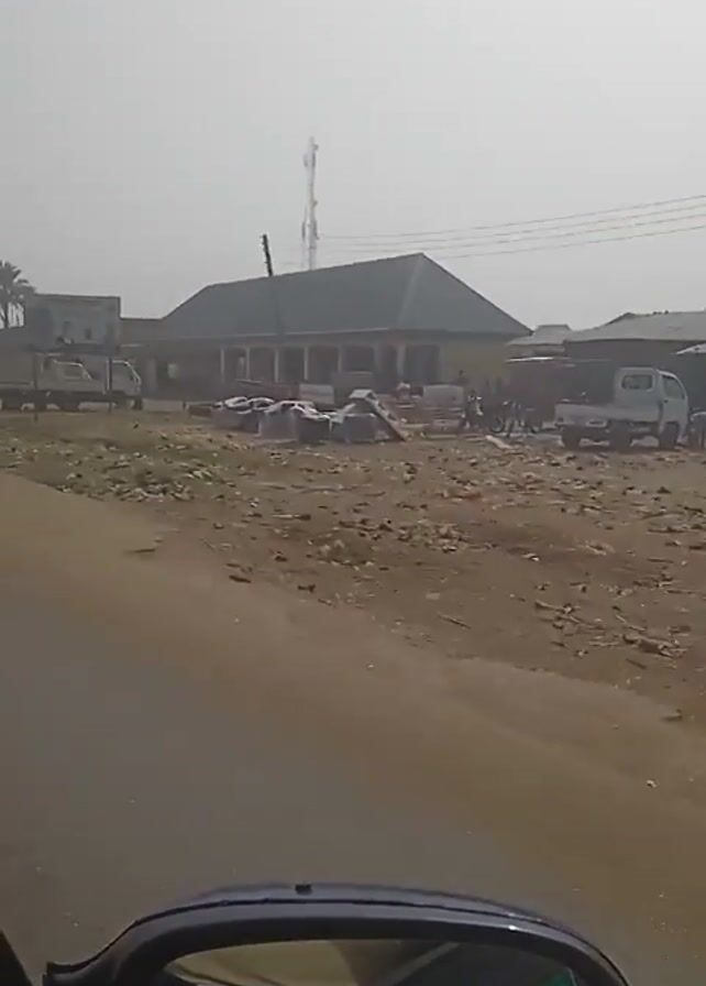 view from inside a car driving on a paved road through a dusty, somewhat rural area. There's a building on the left with a long, covered porch area, and piles of what looks like refuse or construction materials in front of it. A white truck is parked nearby. A tall cell tower is visible in the background. A motorcycle passes the car on the left, and a man walks in the opposite direction on the side of the road. Later, there's a small palm tree in the distance. Several people are walking around in the background. The air seems hazy.