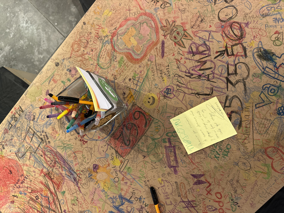 The image captures a cluttered table surface covered in graffiti-like drawings, scribbles, and writing