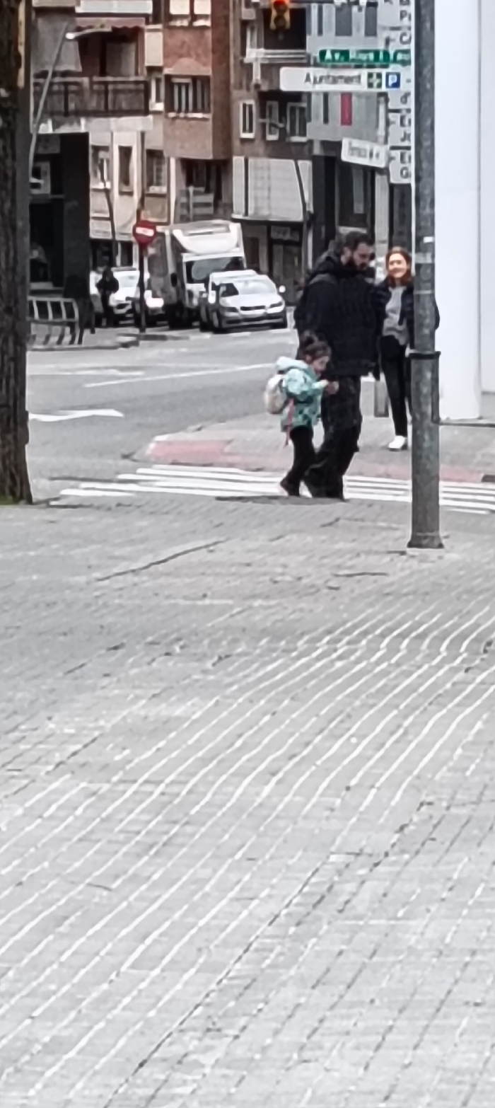 The image displays an urban street scene in Sant Cugat del Vallès, Spain, identifiable by a visible street sign marking "Av. Rius i Taulet" and "Ajuntament." The foreground shows a light grey paved sidewalk with diagonal textured lines, and a portion of a tree trunk on the far left. In the mid-ground, an adult male with a beard, dressed in a dark jacket and dark trousers, walks from right to left across a white-striped pedestrian crossing. A young child, wearing a light blue/green patterned jacket, dark trousers, and a light-colored backpack, walks to the man's left and slightly ahead, appearing to manipulate an object near their waist. Behind the man and child, on the right side of the sidewalk, a woman with reddish-brown hair, wearing a light grey top and dark trousers, stands partially obscured by a dark pole. The street is asphalt, featuring white zebra crossing stripes and a raised reddish-brown section for pedestrian access. In the background, a white box truck is stopped or parked on the street, followed by a light-colored sedan. Various multi-story buildings with windows and balconies line the street. Street furniture includes multiple poles, one with a traffic light showing red and yellow signals, and another displaying a red circular 'no entry' sign, an "Ajuntament" sign, and a 'P' for parking symbol. A dark metal barrier is partially visible on the far left. The scene is illuminated by ambient daylight, suggesting overcast conditions.