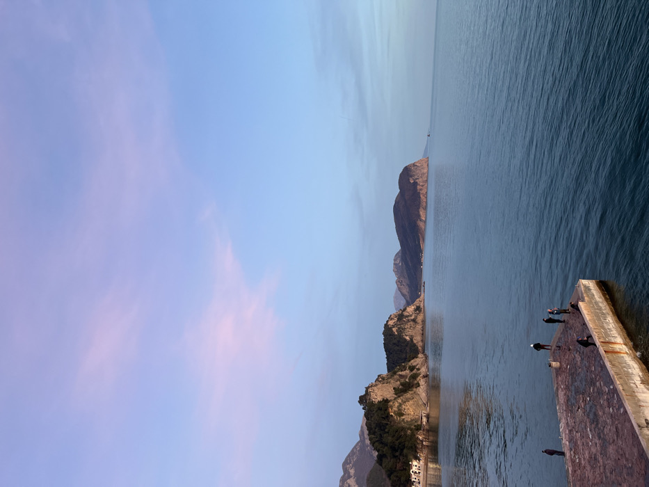 A scenic view captures a vast body of water meeting a mountainous coastline under a gradient sky transitioning from blue to pink. A concrete pier extends into the water on the right, with several people positioned along its edge. Ripples cover the surface of the water, reflecting the light of the sky, and the mountains display rugged texture and scattered vegetation.
