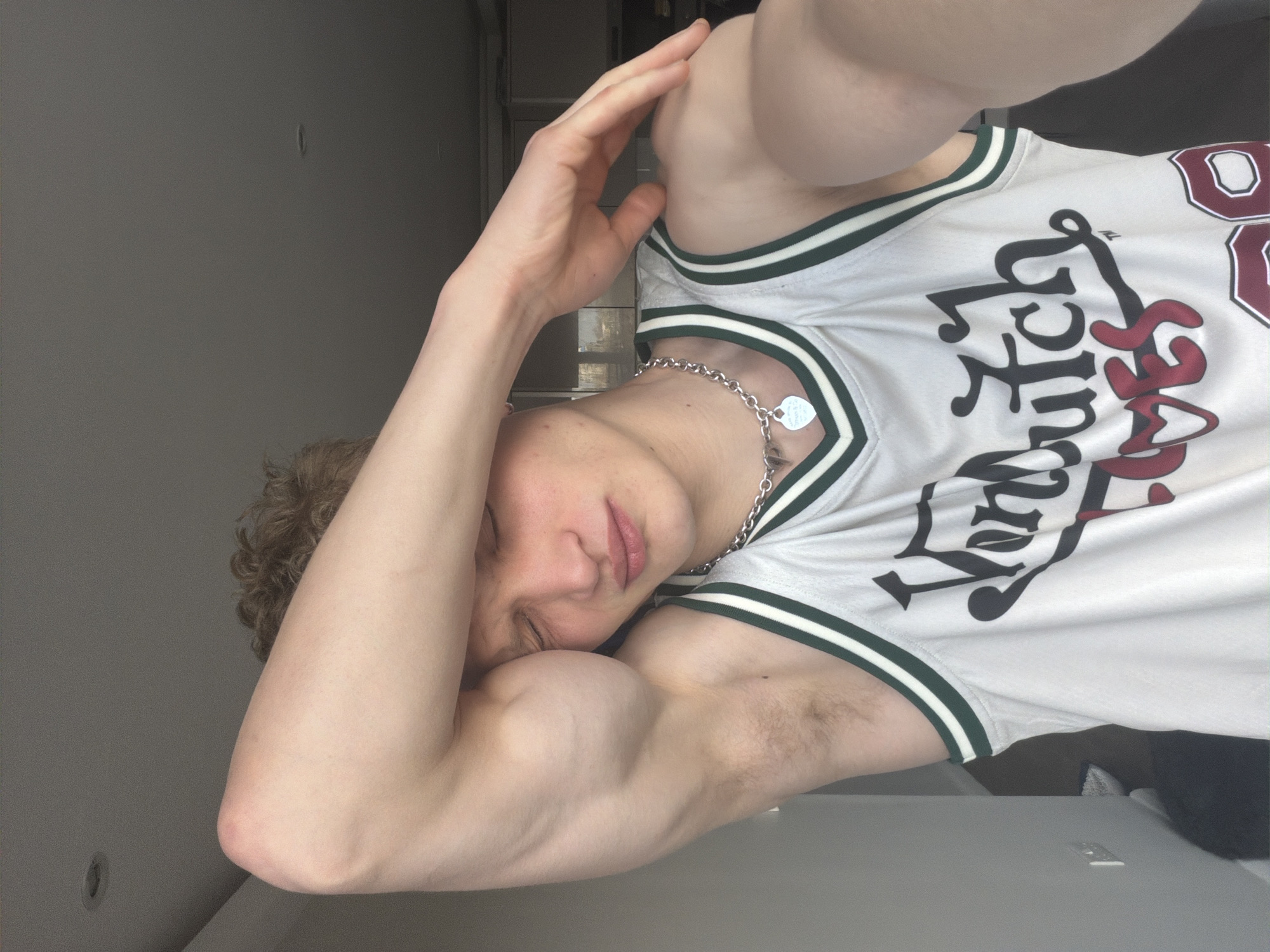 A young adult male, with short curly light brown hair and a light skin tone, is captured in a selfie