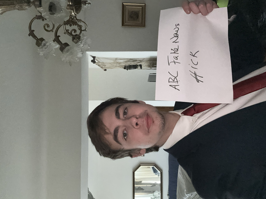 An indoor, eye-level image depicts a light-skinned male, estimated to be in his twenties, with short brown hair and light stubble, looking directly at the camera with a neutral expression. He is dressed in a dark suit jacket, a white collared shirt, and a red tie. The individual holds a white rectangular sign with both hands to his right side. The sign contains two lines of handwritten text in dark ink: "ABC Fake News" on the upper line and "HICK" on the lower line. The background reveals an interior space, identified as being in Vila Real, Portugal. To the left, a rectangular mirror with a gold-toned frame is visible, reflecting a blue surface, possibly furniture. Above and to the right of the subject, a section of a multi-arm chandelier with glass shades and a gold-toned metallic frame hangs from a light-colored ceiling. Further right, a light-colored woven wall hanging and a square framed piece of art with a gold-toned frame are visible on a light-colored wall.