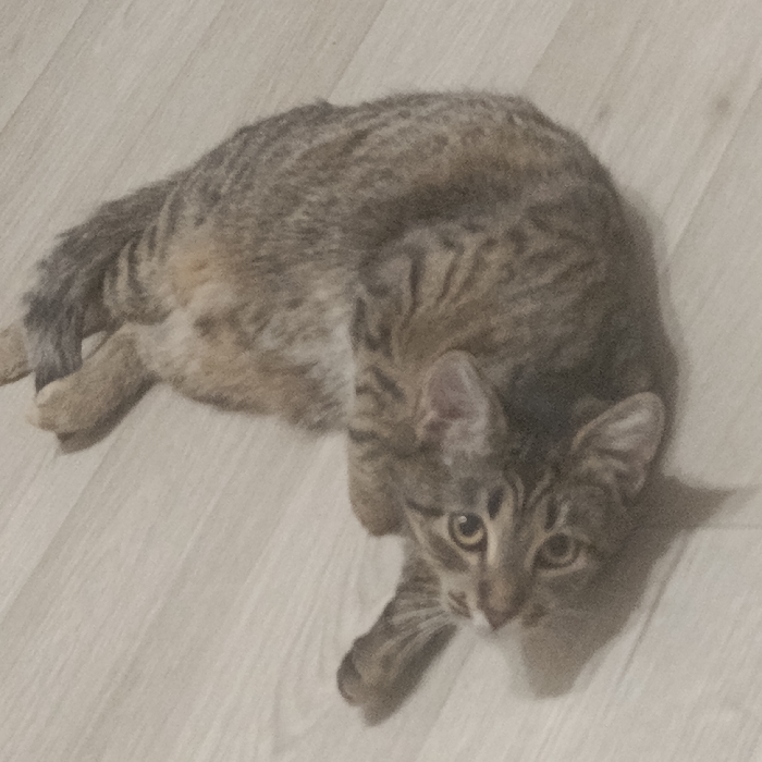 - "A tabby cat lies on a light-colored, possibly wooden floor" by FM-fpfCx2, licensed under CC BY 4.0