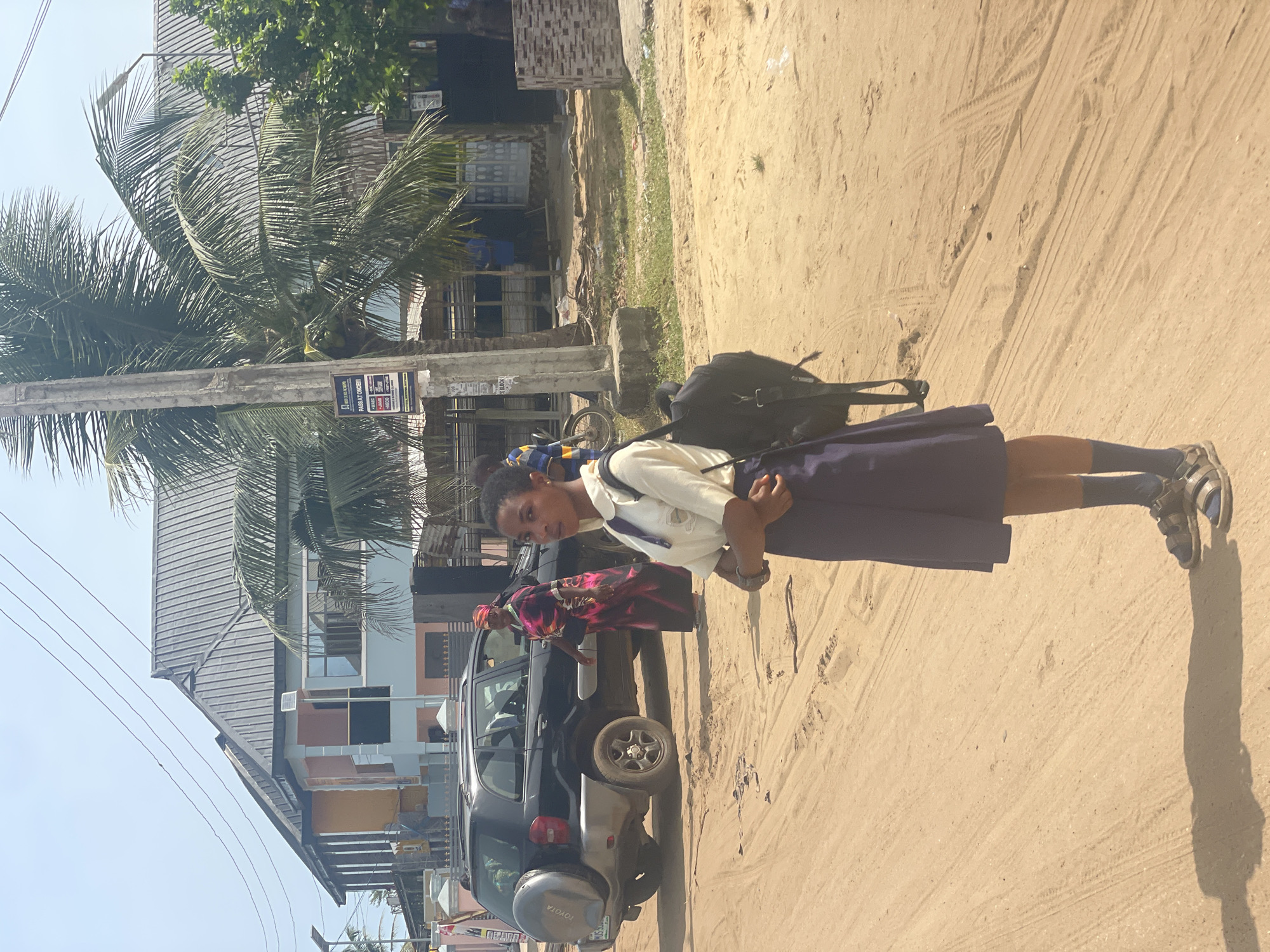 A young girl in a school uniform and sandals is standing on a sandy road in Ikoga, Nigeria. She has a backpack on and is looking at the camera. Beside her is a dark-colored SUV with an older woman seated inside. A palm tree and buildings are in the background. The location appears to be residential. The road is unpaved.