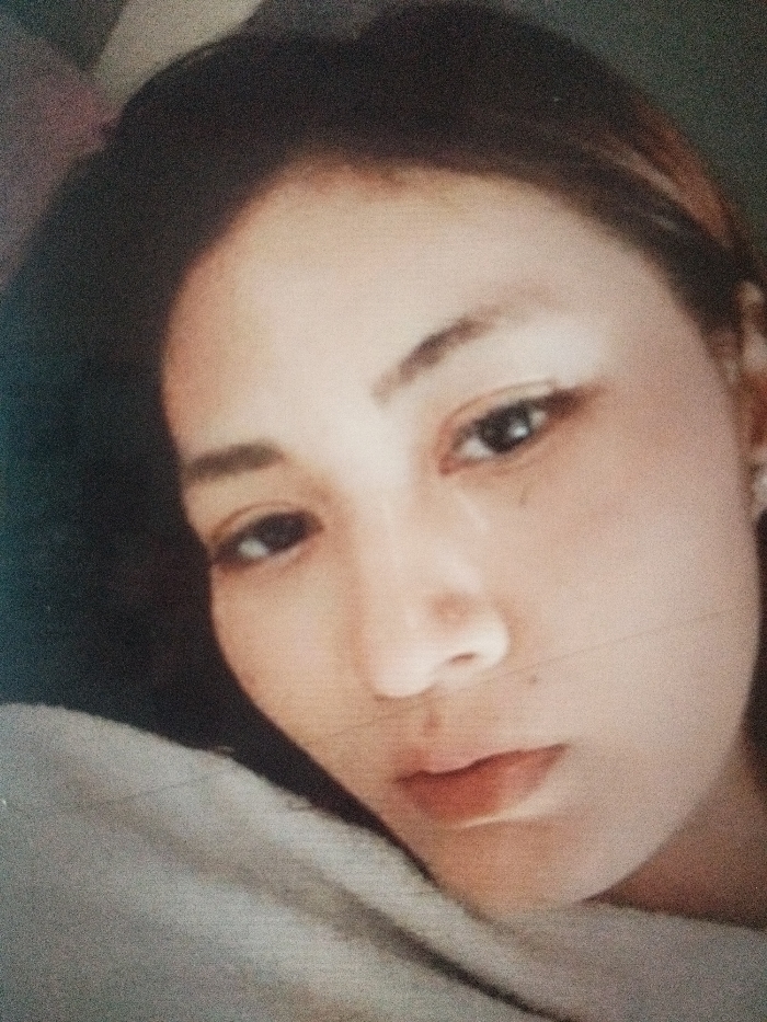 The image depicts a close-up portrait of a young woman, situated indoors in Bogor, Indonesia. Her head is slightly tilted, and she gazes directly at the viewer with a neutral expression. She has dark hair, a fair complexion, and dark eyes. A small, light-colored stud earring is visible in her right ear. Two minor blemishes are present on her face: one below her left eye and another on her chin. Her lips are slightly parted. The lower-left foreground shows a light grey, soft, textured fabric, consistent with bedding or a garment, against which she appears to be resting. The background is dark, out of focus, and featureless, indicating an interior setting with ambient or low lighting conditions. No other individuals, objects, or environmental identifiers specific to Bogor are visible within the frame.