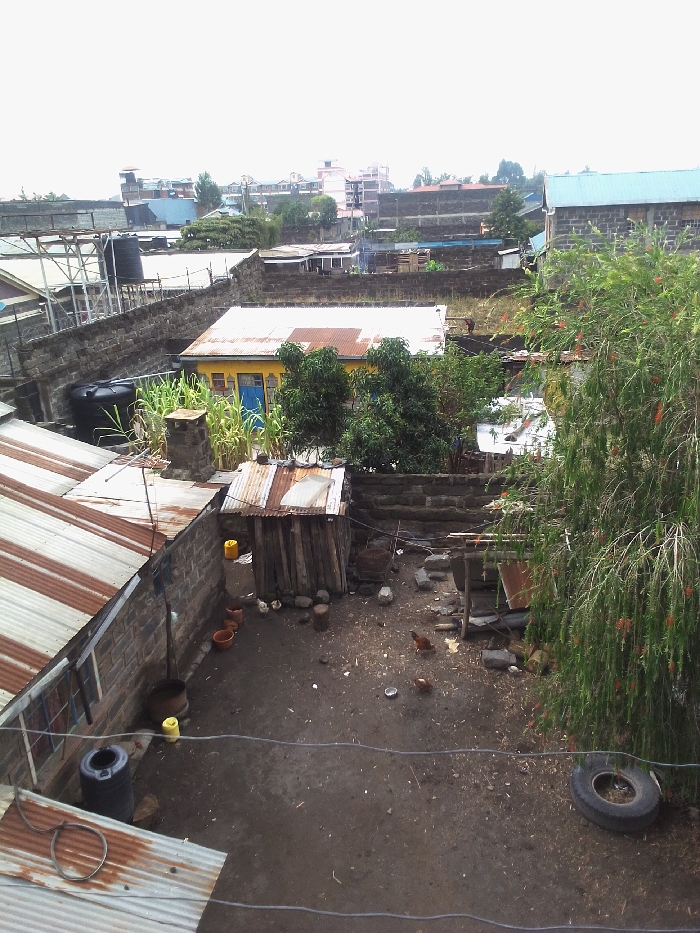 The image depicts an aerial view of a densely packed residential area in Nakuru, Kenya, under an overcast sky. The scene is dominated by a central unpaved dirt courtyard, where several reddish-brown chickens forage. In the immediate foreground, to the lower left, is a portion of a building with a heavily rusted corrugated iron roof. Below this, a grey brick wall runs horizontally, featuring two small, possibly barred, windows. Along this wall, a black plastic water drum, a coiled hose, and a yellow plastic container are situated on the dirt ground. Adjacent to the wall in the courtyard stands a small, rustic shed constructed from vertical wooden planks and topped with a rusted corrugated iron roof; a yellow plastic container is visible inside its opening. Near this shed, several terracotta pots and small wooden stumps are scattered on the ground. Two dark wires extend across the courtyard at ground level. On the far right of the courtyard, a black vehicle tire rests on the dirt. Further into the courtyard, a more rudimentary structure made of planks and a corrugated sheet is present. Behind the courtyard, a small, square stone chimney structure rises, surrounded by tall maize stalks. Immediately behind this, a house with vibrant yellow walls and two bright blue doors is visible, covered by a very rusted corrugated iron roof. Several green trees, including what appears to be a mango tree, are clustered around this yellow house. To the left of the yellow house, on a rooftop, a large black plastic water tank is mounted on a metal stand. The background presents a panorama of various buildings constructed from grey concrete blocks. Roofs are predominantly corrugated iron, showing a mix of rusted red-brown, silver, and some light blue hues. Multiple multi-story structures are visible in the distance, indicating an urban or peri-urban environment with a mix of residential and potentially commercial buildings. No human figures are present in the scene.