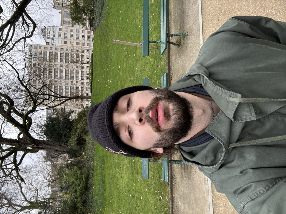 A male individual is depicted in a close-up selfie taken within a public park environment in Paris, France