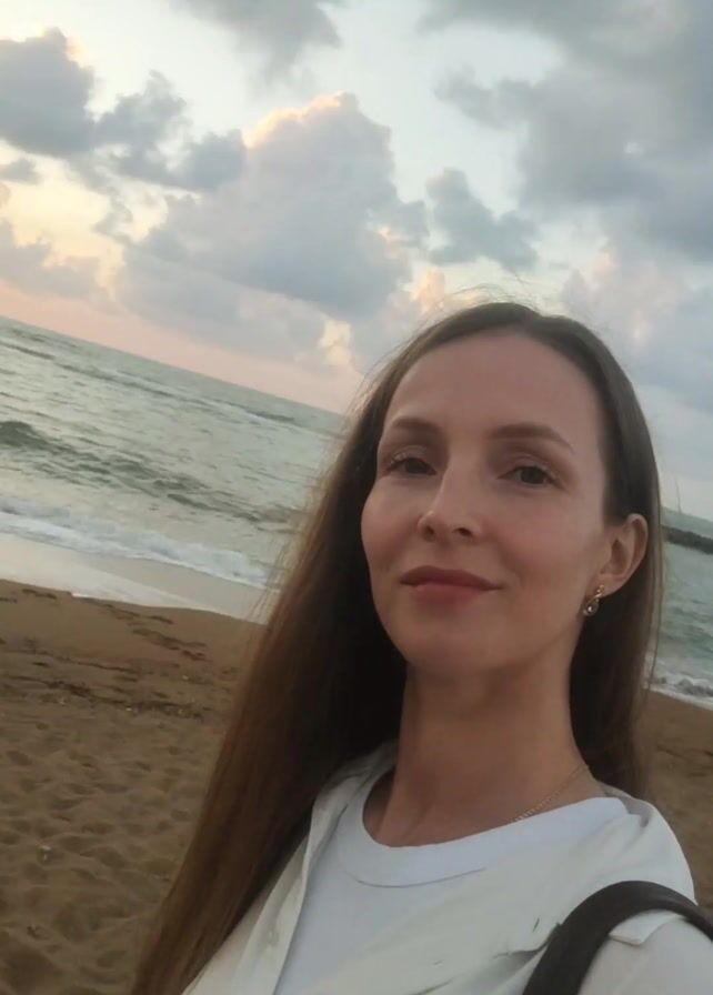 A woman with long brown hair and fair skin is holding a camera in front of her, taking a selfie on a beach