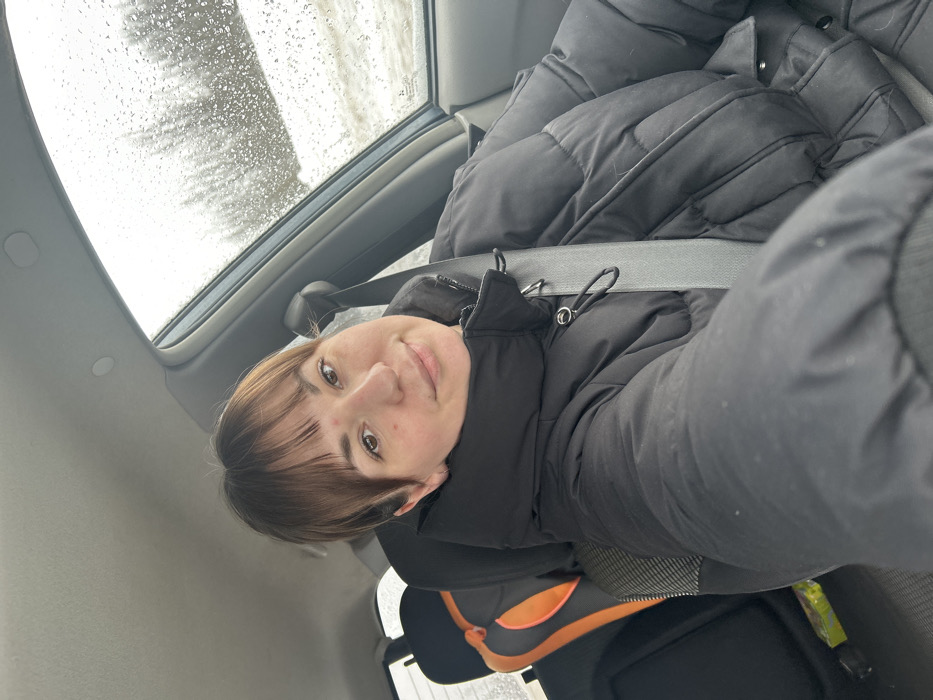 An adult female is depicted in a selfie taken from within a vehicle, described as being in Foki, Russia. She is seated in the front passenger seat, wearing a black, puffy winter jacket and a grey seatbelt secured across her torso. Her brown hair features bangs, and she looks directly at the camera with a slight smile. The vehicle's interior shows a light-colored headliner and a window frame. In the rear passenger area, a child safety seat with orange and black components is partially visible. Through the passenger window, an exterior environment with snow or slush on the ground and bare trees in the distance is visible, with raindrops or condensation present on the glass surface. The sky appears overcast.