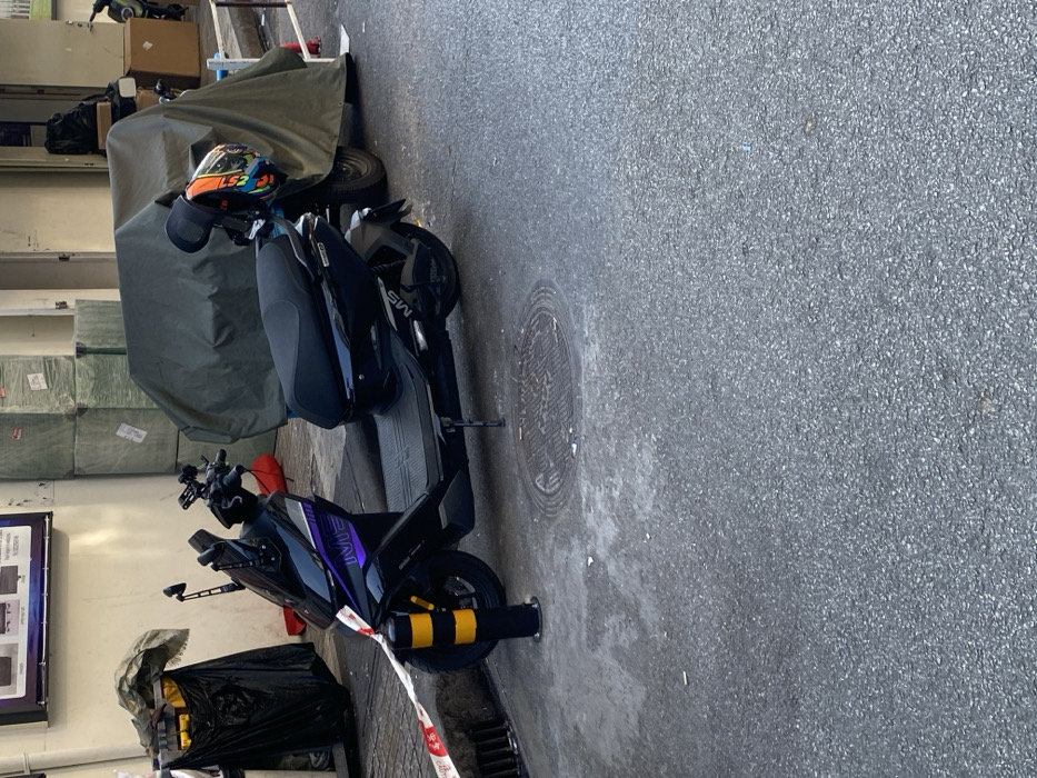 Two motorcycles are parked near a sidewalk. The first is covered with a khaki-colored tarp, and an orange and black helmet rests on its handlebars. The second, a black and purple electric scooter, is parked further down the sidewalk and is partially blocked off by a yellow and black striped bollard and red and white tape. In the background are boxes, a black trash bag, and a building. A manhole cover is set into the street.