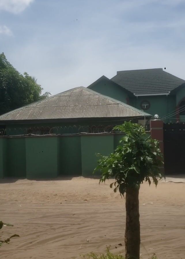 exterior of a green building with a corrugated metal roof, viewed from the ground. A dirt road runs alongside the building. There are trees and plants in the background and foreground. The sky is visible, with a few clouds and power lines. The camera angle shifts, focusing on palm tree leaves and the sky.