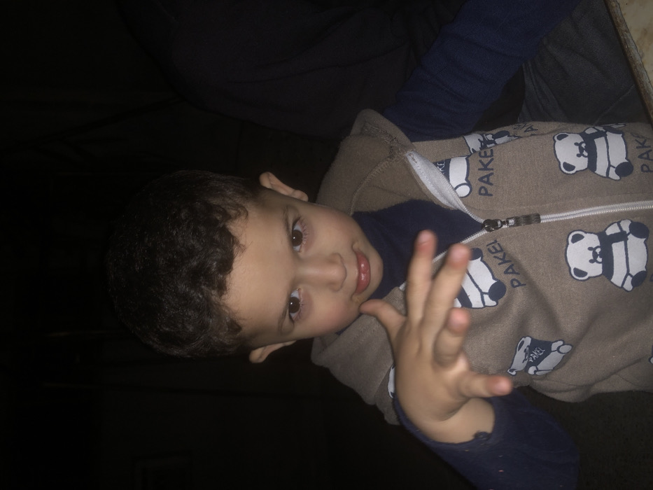 A young child, approximately 3-5 years old, with dark curly hair and brown eyes, is depicted from the chest up, positioned centrally in the frame. The child is wearing a dark blue long-sleeved shirt beneath a beige zippered hooded vest. The vest features a repeating pattern of white teddy bears with blue scarves and the word "PAKEL" printed in blue text. The child's left hand is raised towards the viewer, fingers spread and slightly curled. The child's lips are slightly pursed, and the eyes are directed at the camera. The background is predominantly dark, with a dark form, possibly part of another individual or an object, visible to the right of the child. The scene is illuminated by a frontal light source, contrasting with the dark background. The location is At-Tall, Syria.