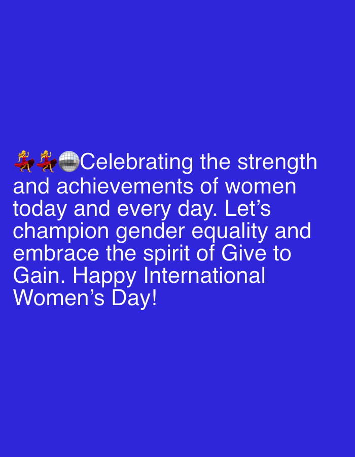 This image is a digital graphic displayed on a solid royal blue background. No physical location, including any specific area within the city of Ado, Nigeria, is depicted. The graphic features white sans-serif text positioned in the upper-left quadrant, preceded by three emojis. From left to right, these emojis are: two instances of a woman dancing in a red dress, followed by a silver disco ball. The text reads: "Celebrating the strength and achievements of women today and every day. Let's champion gender equality and embrace the spirit of Give to Gain. Happy International Women's Day!" No physical people, objects, actions, or interactions are present or visually represented in a real-world environment.