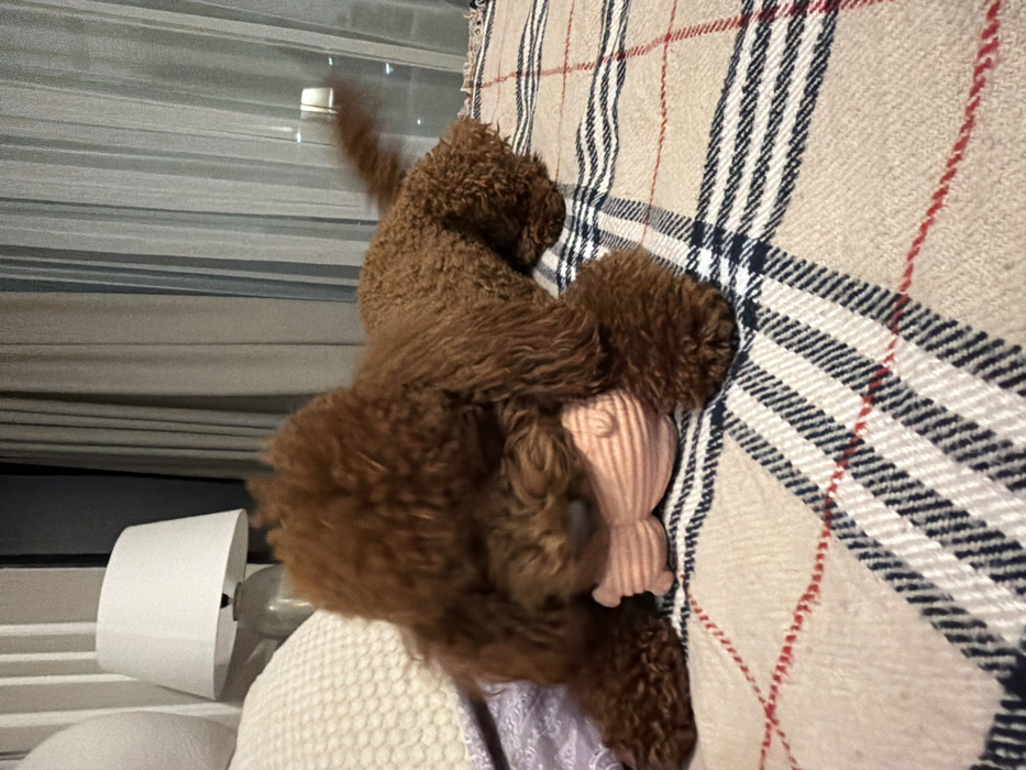 The scene depicts an interior setting, likely a bedroom, in Sofia, Bulgaria, during evening or nighttime hours. A medium-sized, curly-haired brown dog lies on its abdomen on a bed. Its head is turned to the left, resting on a small, light pink, ribbed plush toy positioned between its front paws. The dog's tail is blurred, indicating motion. The bed is covered by a light beige plaid blanket with thin dark blue/black and red intersecting lines. To the left of the dog, a cream-colored textured pillow and a section of purple fabric are visible. In the background, behind the dog, a bedside lamp with a white cylindrical shade and a grey base is situated on a surface. Behind the lamp, a window is visible, covered by light-colored sheer curtains with vertical stripes. Distant illuminated points are faintly discernible through the window, suggesting an urban exterior at night.