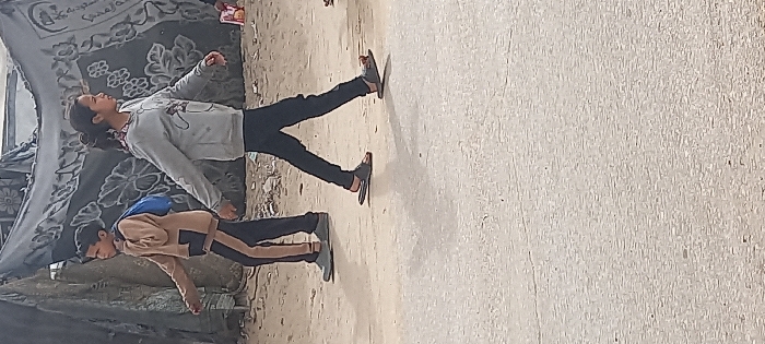 Two young individuals are walking from left to right across a light-colored paved surface in Khan Yunis, Palestinian Territory