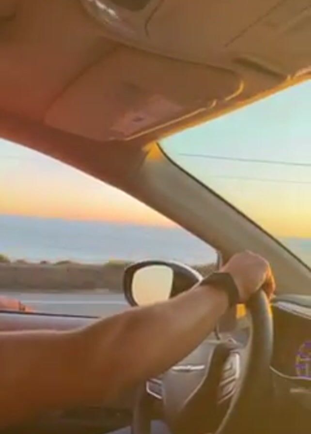 A person drives a car, viewing the sunset on the ocean through the front windshield