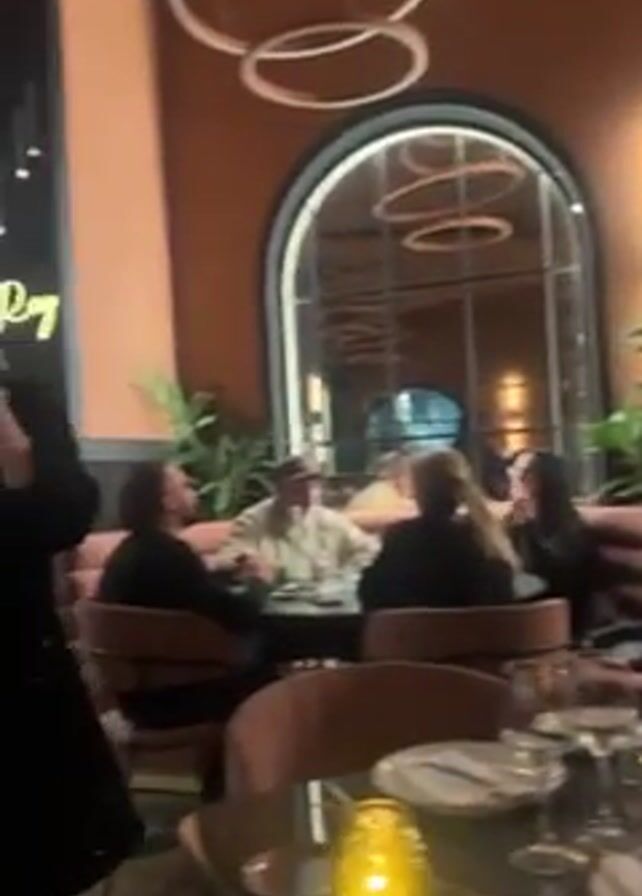 restaurant setting with people seated at tables. There are mirrors on the wall, circular light fixtures, and a plant. A woman in a black dress is singing into a microphone. A man is standing at a computer to her left.