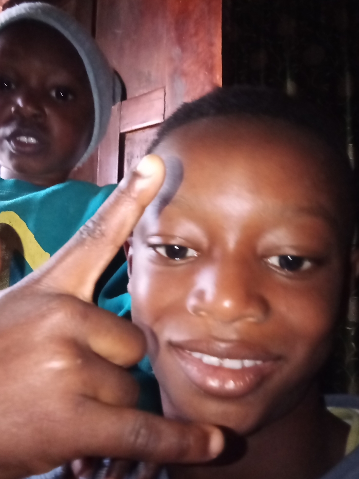 This image depicts two individuals positioned in front of a wooden background within what is specified as Sabon Tasha, Nigeria. In the foreground, a young person with dark skin and a short dark haircut is visible from the chest up, facing the camera with a smile, teeth visible. This individual's right hand is raised near the right side of their head, forming a gesture with the thumb and pinky finger extended and the middle fingers folded. The subject wears a dark-colored garment. Behind and slightly to the left, a second, younger individual with dark skin is partially visible, wearing a light grey head covering and a teal or dark green top with a yellow emblem. This individual's eyes are open, and their mouth is slightly ajar, revealing teeth. The background consists of a brown wooden surface, possibly a door or wall, exhibiting grain and paneling. Lighting appears somewhat dim.