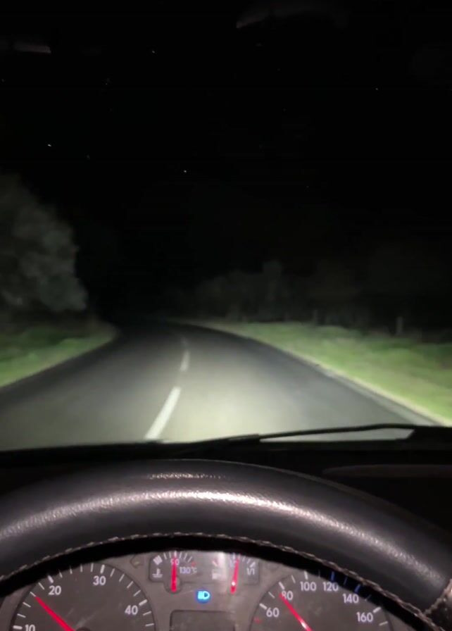 person driving a car on a dark, empty road at night. The view is from the driver's perspective, focusing on the road ahead and the car's dashboard. The car's headlights illuminate the road, lined by trees on either side. The dashboard displays the car's speed, and engine temperature. The speedometer indicates the car is accelerating from 50 km/h to 100 km/h. Rap music is playing in the background.