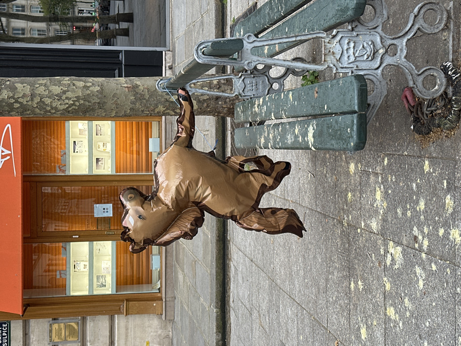 - "A deflated, brown, foil balloon, shaped like a standing bear or similar quadrupedal animal, is suspended mid-air next to a public park bench on a sidewalk in Paris, France" by FM-Wk3AI2, licensed under CC BY 4.0