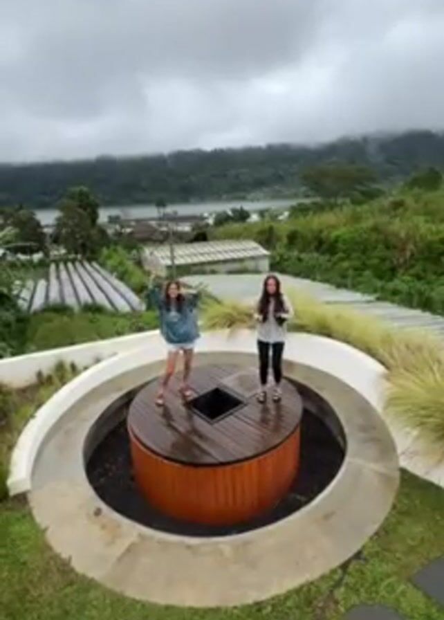 Two young women are standing on a round wooden platform with a square hole in the center, surrounded by a circular concrete border
