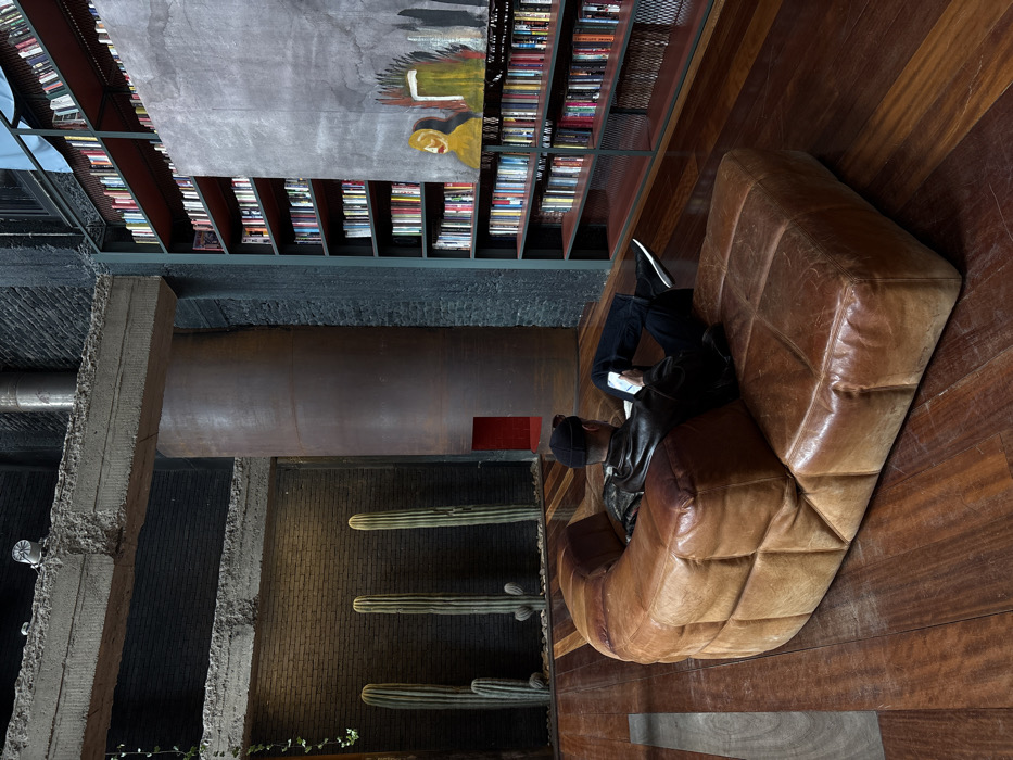 This image captures an interior scene within the Stamba Hotel, located at 14 Merab Kostava Street, Tbilisi, Georgia. A single individual is seated in the foreground, facing away from the viewer, on a large, curved, modular sofa upholstered in distressed brown leather. The person is wearing a black jacket, dark trousers, black sneakers with white soles, and a black beanie with dark sunglasses perched on top. They are holding a white smartphone, looking down at its screen. The floor beneath is made of polished dark brown hardwood planks, featuring a lighter rectangular inlay to the left of the sofa. In the midground, a prominent, rust-colored cylindrical metal column extends vertically, with a red rectangular niche cut into its lower section. To the left of this column, a dark brick wall serves as a backdrop for four tall, slender columnar cacti. Above the brickwork, raw concrete beams and dark, textured walls are visible, along with a trailing green plant hanging from above. To the right, a floor-to-ceiling bookshelf system occupies the wall. It consists of multiple shelves filled with books, organized in rows, with dark metal frames and red-toned shelf bases. A large, gray rectangular panel displaying an abstract painting is integrated into the lower-mid section of the bookshelf. The artwork features two stylized figures, one yellow, and colorful abstract shapes against a dark background. Above the bookshelf, a light blue fabric element is visible. The overall environment is dimly lit, emphasizing industrial and natural textures.