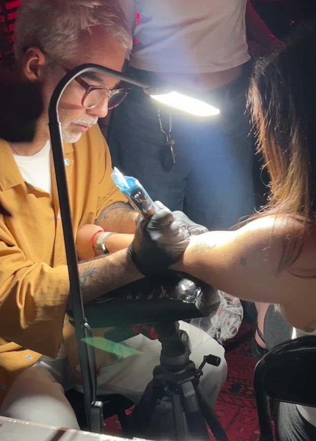 A man with glasses and a mustard-yellow jacket is tattooing the forearm of a person in a white tank top. He wears black gloves and uses a tattoo machine with blue components. A bright light illuminates the area where he is working, which rests on a padded support stand attached to a tripod. Another person wearing a white t-shirt and jeans stands behind the person being tattooed. The environment is indoors, with red lighting in the background and a patterned tablecloth on the working surface. The tattoo artist is focused on his work, while the person receiving the tattoo remains still.