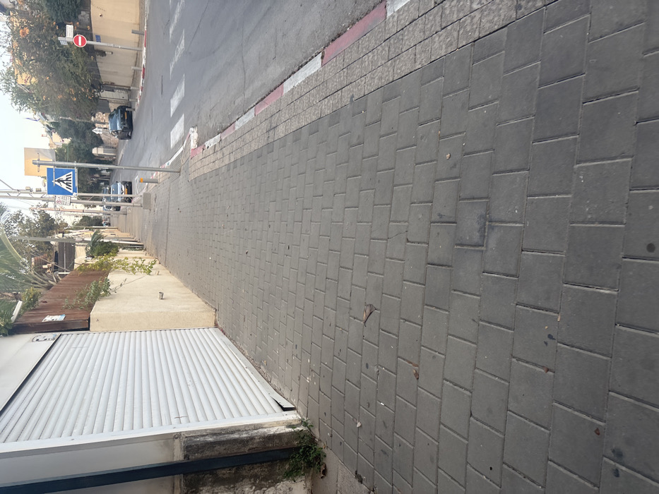 The image depicts a static street scene in Tel Aviv, Israel, characterized by typical Israeli road signage and urban architecture. The scene is viewed from a low angle, looking eastward along a paved sidewalk adjacent to a public road. In the foreground, a grey concrete paver sidewalk extends into the distance. Scattered dry leaves and small debris are visible on its surface. To the immediate left, a white horizontal slat roll-down security shutter covers a building entrance, with a patch of green weeds growing at its base. Adjacent to this, a light-colored, possibly stucco, wall runs alongside the sidewalk, topped by a wooden fence, with green foliage overgrowing parts of it. To the right of the sidewalk, a curb delineates the transition to an asphalt road. This curb is painted red and white, indicating a no-parking or no-stopping zone. A white pedestrian crosswalk is painted on the asphalt road surface, and several grey bollards are positioned near it along the curb. In the mid-ground and background, the road ascends slightly, flanked by buildings and trees. Multiple vehicles are visible: two dark-colored sedans are parked on the left side of the road, and a dark-colored SUV is visible further down on the right. Street signs are present, including a blue square sign with a white pedestrian icon, denoting a pedestrian crossing, and a red circular sign with a white horizontal bar, indicating "No Entry." Other metallic poles, likely for streetlights or additional signage, are also visible. No individuals are present in the image, and no actions or interactions are depicted. The environment appears clean and well-maintained under clear daylight conditions.