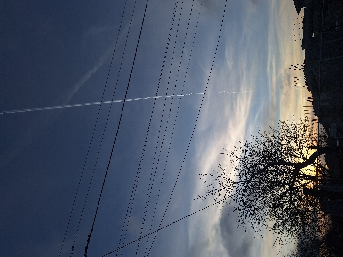 The scene depicts an outdoor environment in Dolni Chiflik, Bulgaria, at twilight. The sky transitions from a deep blue at the top to lighter blues and yellow-orange at the horizon, indicating either sunrise or sunset. A prominent, linear white aircraft contrail extends vertically through the sky, originating from the top edge and extending towards the bottom-center. A second, fainter, more dissipated contrail is visible diagonally in the upper-right quadrant. Multiple dark, thin utility lines span horizontally and diagonally across the upper and middle sections of the image. In the lower-left, a large, leafless deciduous tree is silhouetted against a bright, low-lying light source. The lower-right foreground contains the dark silhouettes of distant building rooftops and a low fence structure, behind which several vertical, slender dark objects are present. No individuals, specific actions, or interactions are observable.