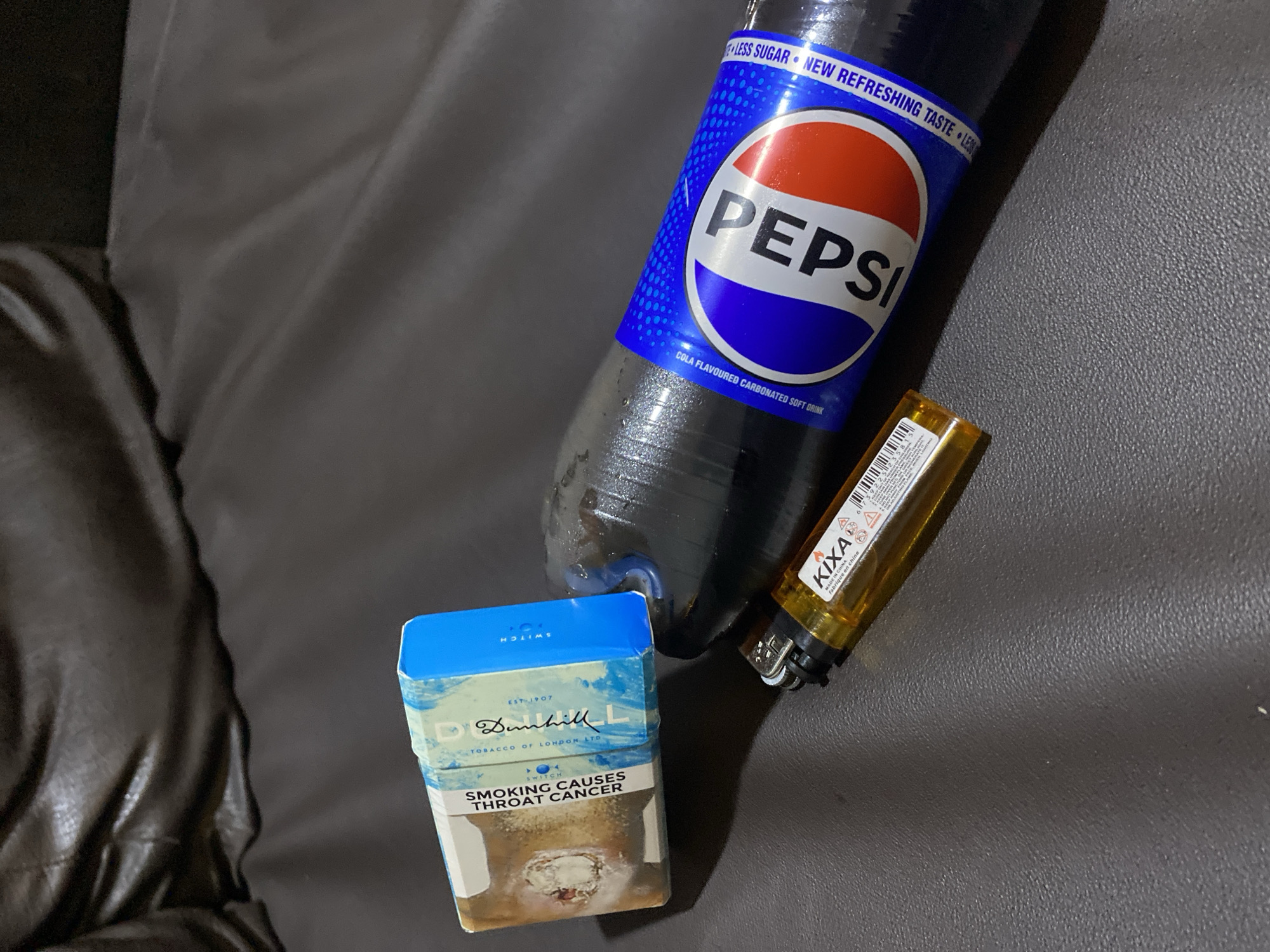 The image depicts a casual scene with a few common items. A bottle of Pepsi is prominently featured, along with a pack of Dunhill cigarettes displaying a health warning ("SMOKING CAUSES THROAT CANCER") and a KIXA lighter. The objects are arranged on what appears to be a dark, textured surface, possibly a leather or faux-leather couch or chair. There is no indication of a location in the city of Kubwa, Nigeria. No people, actions, or interactions are directly visible in the image.