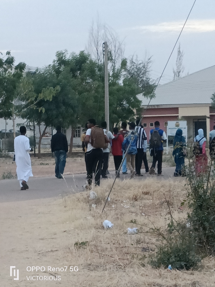 A group walks along a road, mostly facing forward. Some wear backpacks, and one person dons a soccer jersey. Others wear casual clothing, including traditional robes. A building with signage stands in the background, partially obscured by trees and power lines. The foreground is characterized by dry, grassy vegetation with scattered litter. The image is somewhat muted in color and seems taken during daylight.