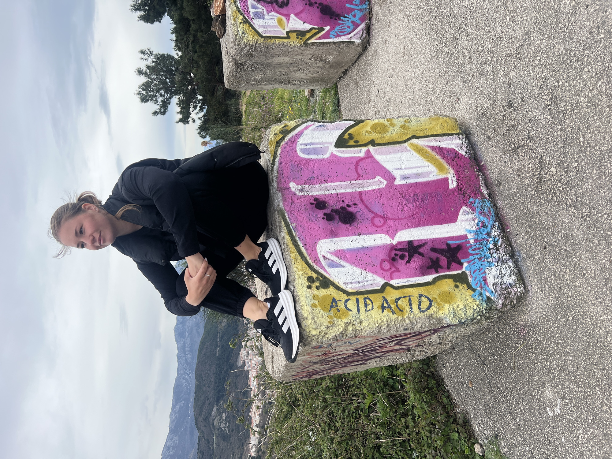 A young woman wearing black clothing and black and white Adidas sneakers is crouching on a concrete structure adorned with graffiti. The graffiti on the concrete includes the words "ACID ACID" in yellow paint. The structure appears to be part of a retaining wall or barrier along a road or path. The woman is looking to her left. In the background, a mountainous landscape can be seen, with a cloudy sky overhead. The scene is located in Podostrog, Montenegro, as evidenced by the architecture of the buildings visible on the mountainside. Vegetation is growing nearby. The pavement of the pathway is visible.