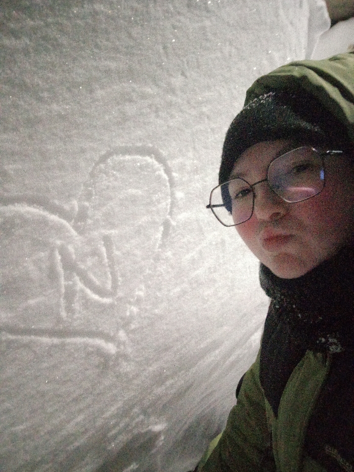 A close-up, low-light image depicts a single individual and a snow-covered surface. The scene is located in a snowy outdoor environment within Старый Шагирт, Russia. The individual, positioned in the right two-thirds of the frame, is looking directly at the camera with a slight pout. They are wearing a dark knit beanie, octagonal-framed eyeglasses (reflecting a light source), a dark scarf, and a green winter jacket. Their cheeks are flushed red. The left portion of the image displays a textured layer of fresh snow. Imprinted into this snow is a heart shape, within which the capital letter 'N' is drawn. Additional faint indentations are present in the snow below and to the left of the heart. The snow surface exhibits glistening specks, indicative of ice crystals under artificial illumination.