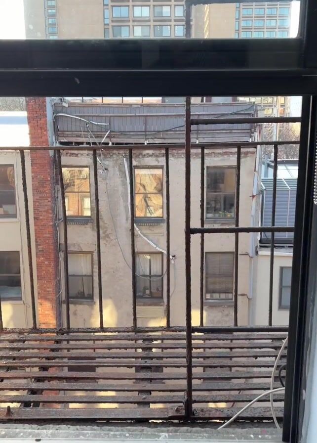 view of a cityscape from behind a window with a fire escape. The window has a black frame and there is a striped cushion below it. The fire escape is rusty and has horizontal bars. Beyond the fire escape are several buildings of varying heights and architectural styles. A tall, modern glass building is visible on the left side of the frame. The sky is blue with a few clouds. The video zooms out slightly, revealing more of the cityscape. An ambulance siren can be heard in the background.