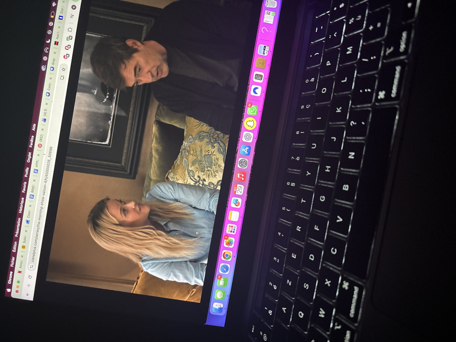 MacBook laptop operating in a dimly lit room in Maisons-Alfort, France. The laptop's screen displays a video from "The Morning Show" (Season 4) via the Canal+ website within a Google Chrome browser. The video content features two individuals: a blonde woman in a light blue collared shirt looking towards a dark-haired man in a dark jacket, who is looking down and to his left. They are depicted in an interior setting with sofas and decorative pillows. Below the video, the macOS Dock is visible, illuminated with a pink/purple hue, displaying various application icons including Mail, Calendar (showing "Oct 29"), Spotify, WhatsApp, and Snapchat. The laptop's AZERTY keyboard is backlit, with keys illuminated against the dark chassis.