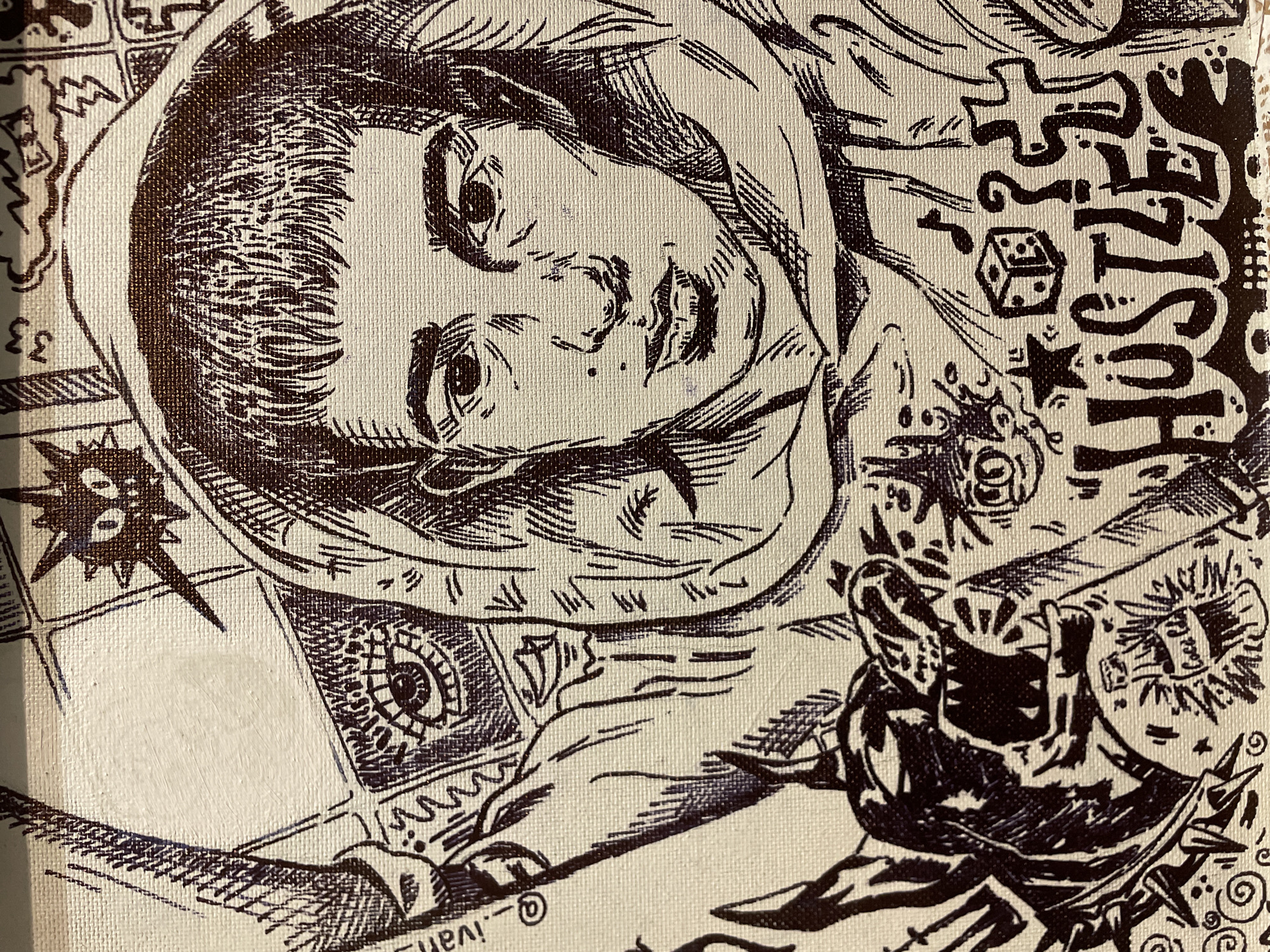 The image depicts a detailed monochrome illustration on what appears to be a canvas