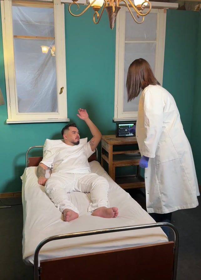 A man wearing a white outfit and lying on a hospital bed throws a piece of bedding at a woman with brown hair wearing a white lab coat and blue gloves