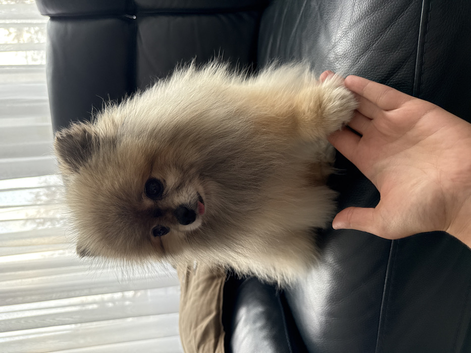 - "A Pomeranian dog with light brown and cream-colored fur is depicted seated on a black leather sofa, its front right paw resting within an open, palm-up human left hand" by FM-OZmdD3, licensed under CC BY 4.0