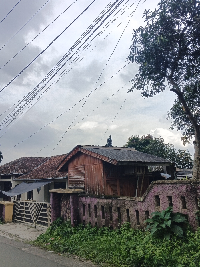 This image captures a static outdoor residential scene in Siexiengmai, Laos, under an overcast sky. The foreground features a segment of a dark asphalt road or path, adjacent to a strip of dense green vegetation comprising various plants and grasses. Behind the vegetation, a low, weathered concrete or stone wall, painted or stained in a faded reddish-purple hue, runs horizontally across the frame. This wall incorporates several vertical rectangular openings. To the far left, a light-colored metal gate with geometric X-shaped patterns is partially visible, providing access to the property beyond the wall. In the midground, a prominent two-story wooden structure with a corrugated metal roof is visible behind the wall. This structure is predominantly reddish-brown, exhibiting signs of weathering, with horizontal wooden planks on its left face and a distinct pattern of angled wooden elements on its right face, implying a sheltered or enclosed space beneath. To the immediate left of this wooden structure, a larger, light-colored house with a red-tiled roof is partially visible, with a dark-colored awning or tarp extended over a portion of its facade. A large tree with a substantial trunk and dense, dark green foliage occupies the right side of the image, extending into the upper right corner. Additional green trees and foliage are discernible in the background. The upper portion of the frame is dominated by an overcast sky, characterized by diffused gray and white clouds. Numerous dark utility lines crisscross diagonally against the sky, extending from the upper left towards the mid-right. No individuals, animals, or dynamic actions are depicted within the scene.